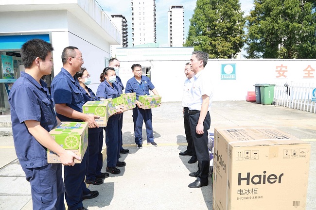 為切實(shí)做好夏季防暑降溫工作,保障高溫期間全體職工的身體健康,確保生產(chǎn)經(jīng)營(yíng)工作順利進(jìn)行,8月11日下午,安慶港華常務(wù)副總楊善俊、工會(huì)主席韓高中一行來到港華路加氣站、雙井街路段戶內(nèi)管外移作業(yè)現(xiàn)場(chǎng)及北部新城調(diào)峰站等處,看望慰問高溫下始終堅(jiān)守在一線崗位的燃?xì)夤ぷ髡?,并送去冷柜、飲用水和防暑降溫用品,把公司的關(guān)懷送到職工們的心坎里。