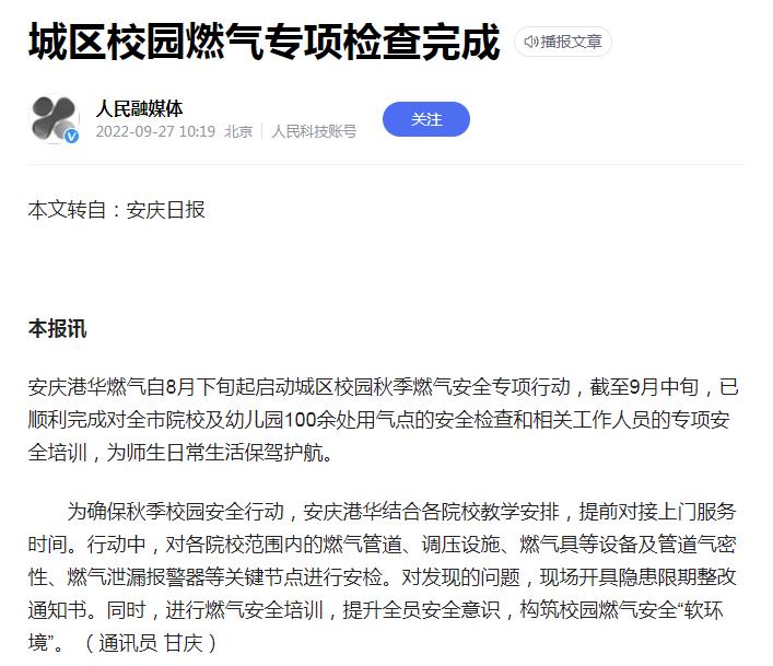 城區(qū)校園燃?xì)鈱?zhuān)項(xiàng)檢查完成(轉(zhuǎn)載于人民網(wǎng)融媒體)