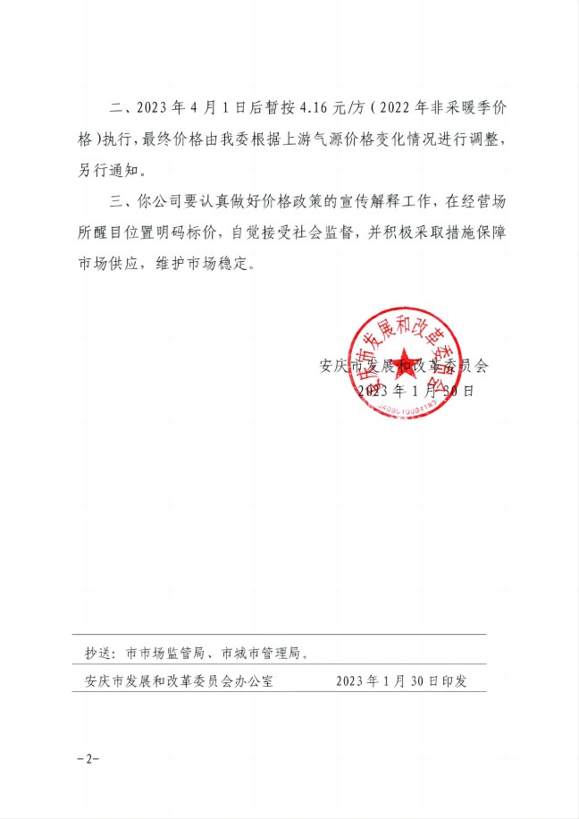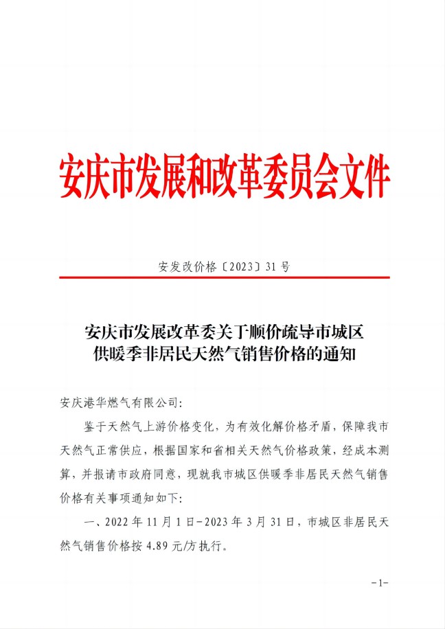 安慶市發(fā)展改革委關(guān)于順價(jià)疏導(dǎo)市城區(qū)供暖季非居民天然氣銷(xiāo)售(2023)價(jià)格的通知-安發(fā)改價(jià)格【2023】31號(hào)