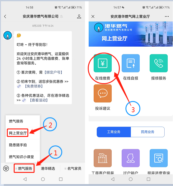 微信公眾號:關(guān)注我公司微信公眾號“安慶港華燃?xì)庥邢薰尽?,點擊“燃?xì)夥?wù)”-“網(wǎng)上營業(yè)廳”,在網(wǎng)上營業(yè)廳中選擇“在線繳費”,即可繳納燃?xì)赓M或者預(yù)存氣費。