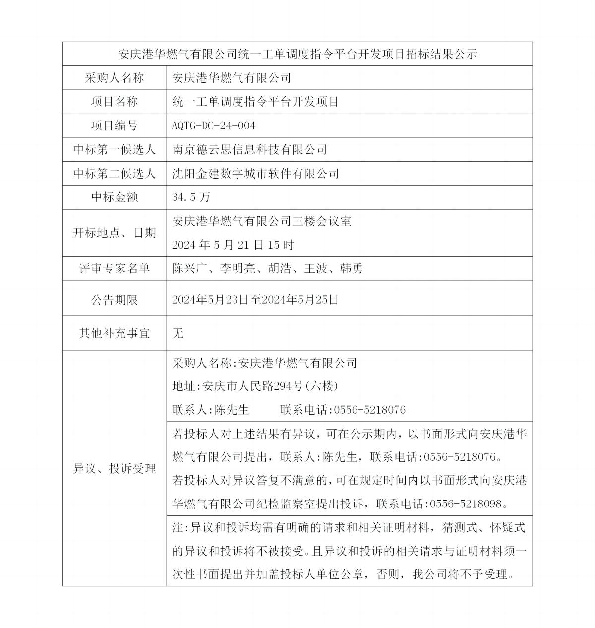 安慶港華燃?xì)庥邢薰窘y(tǒng)一工單調(diào)度指令平臺(tái)開發(fā)項(xiàng)目招標(biāo)結(jié)果公示