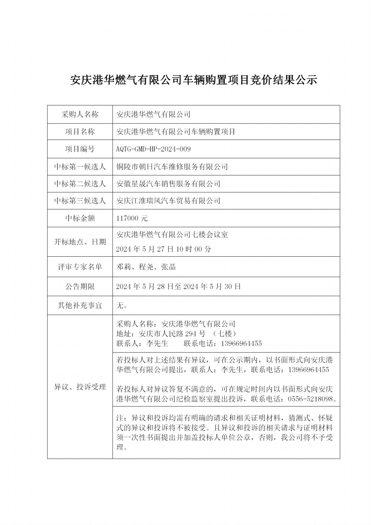 安慶港華燃?xì)庥邢薰拒囕v購置項(xiàng)目競(jìng)價(jià)結(jié)果公示