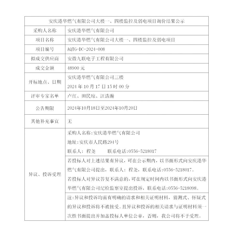 安慶港華燃?xì)庥邢薰敬髽且?、四樓監(jiān)控及弱電項(xiàng)目詢價(jià)結(jié)果公示