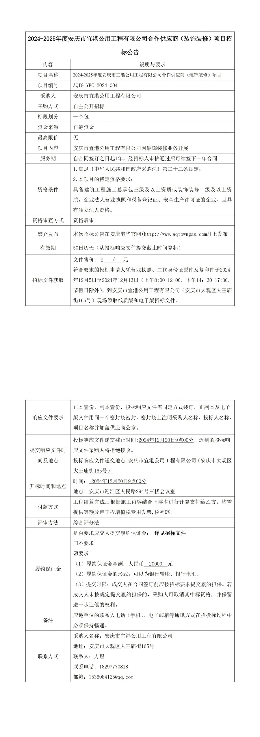 2024-2025年度安慶市宜港公用工程有限公司合作供應商(裝飾裝修)項目招標公告