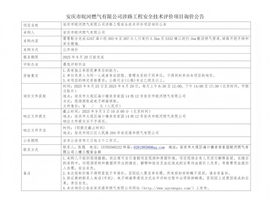 安慶市皖河燃氣有限公司涉路工程安全技術(shù)評價項目詢價公告