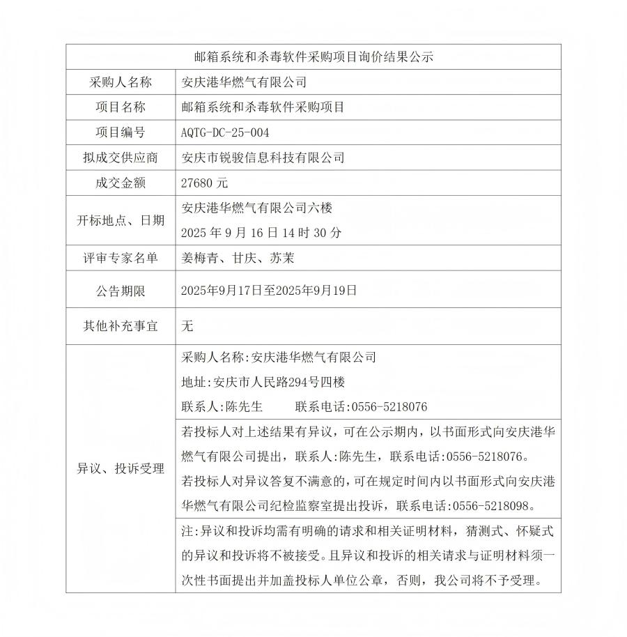 郵箱系統(tǒng)和殺毒軟件采購(gòu)項(xiàng)目詢(xún)價(jià)結(jié)果公示
