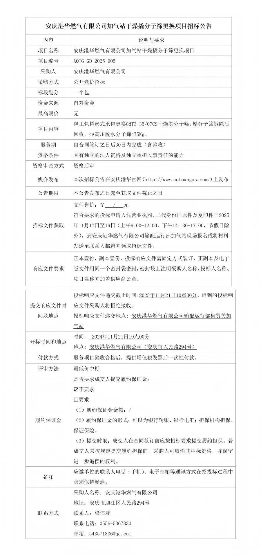 安慶港華燃?xì)庥邢薰炯託庹靖稍锴朔肿雍Y更換項目招標(biāo)公告