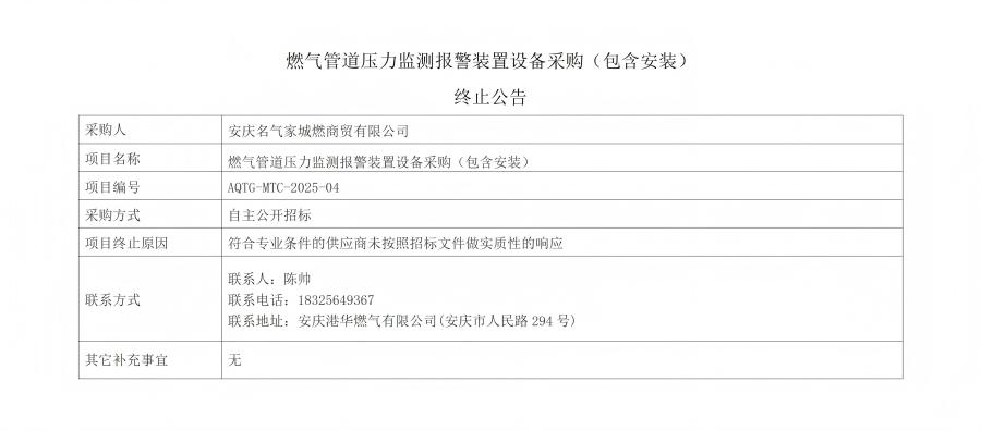 燃氣管道壓力監(jiān)測報警裝置設(shè)備采購(包含安裝)終止公告