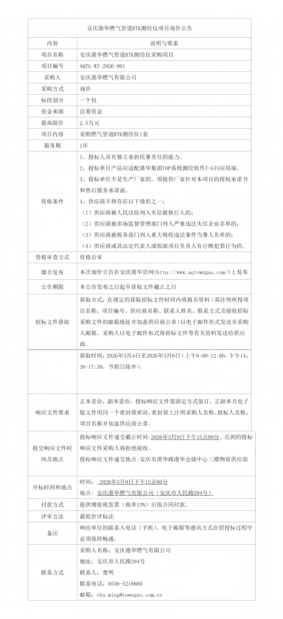 安慶港華燃?xì)夤艿繰TK測繪儀項(xiàng)目詢價公告 發(fā)布時間:2026-03-04    閱讀次數(shù):47次