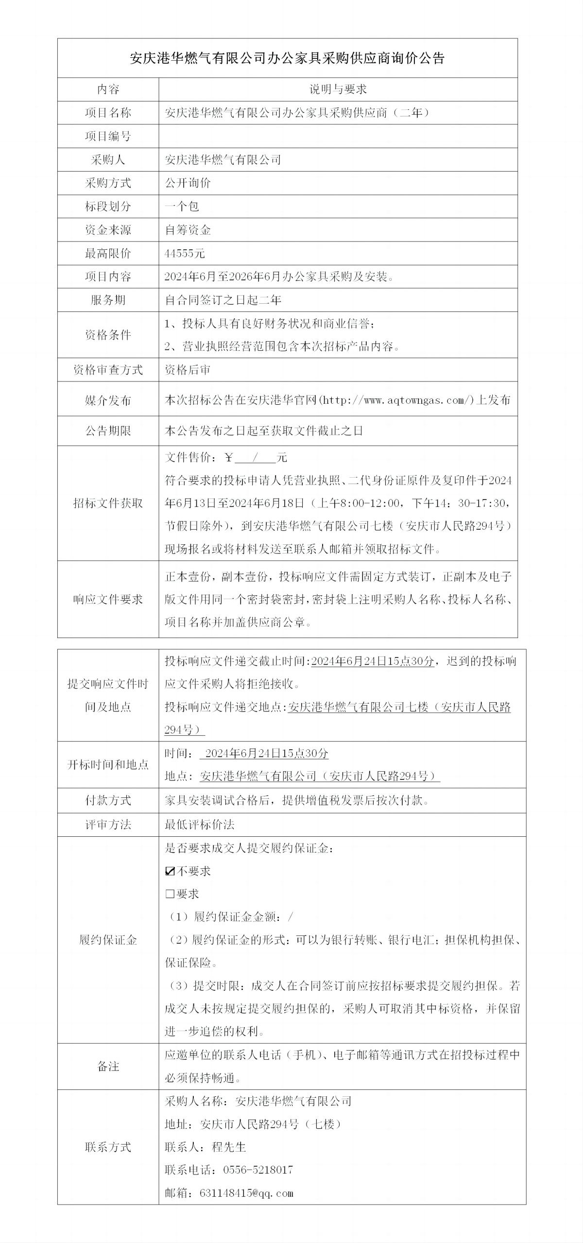 安慶港華燃氣有限公司辦公家具采購供應(yīng)商詢價公告