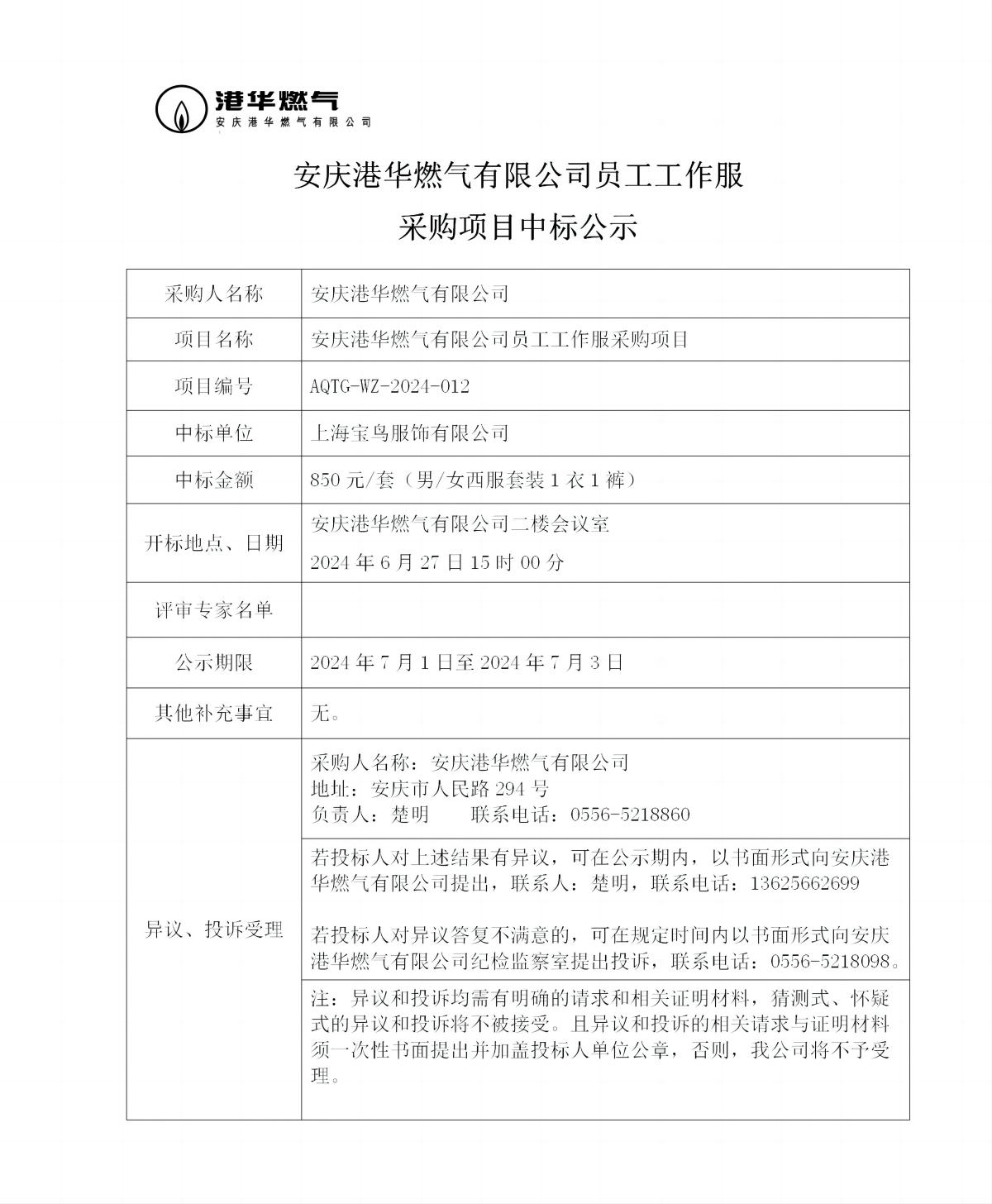 安慶港華燃?xì)庥邢薰締T工工作服采購項目中標(biāo)公示