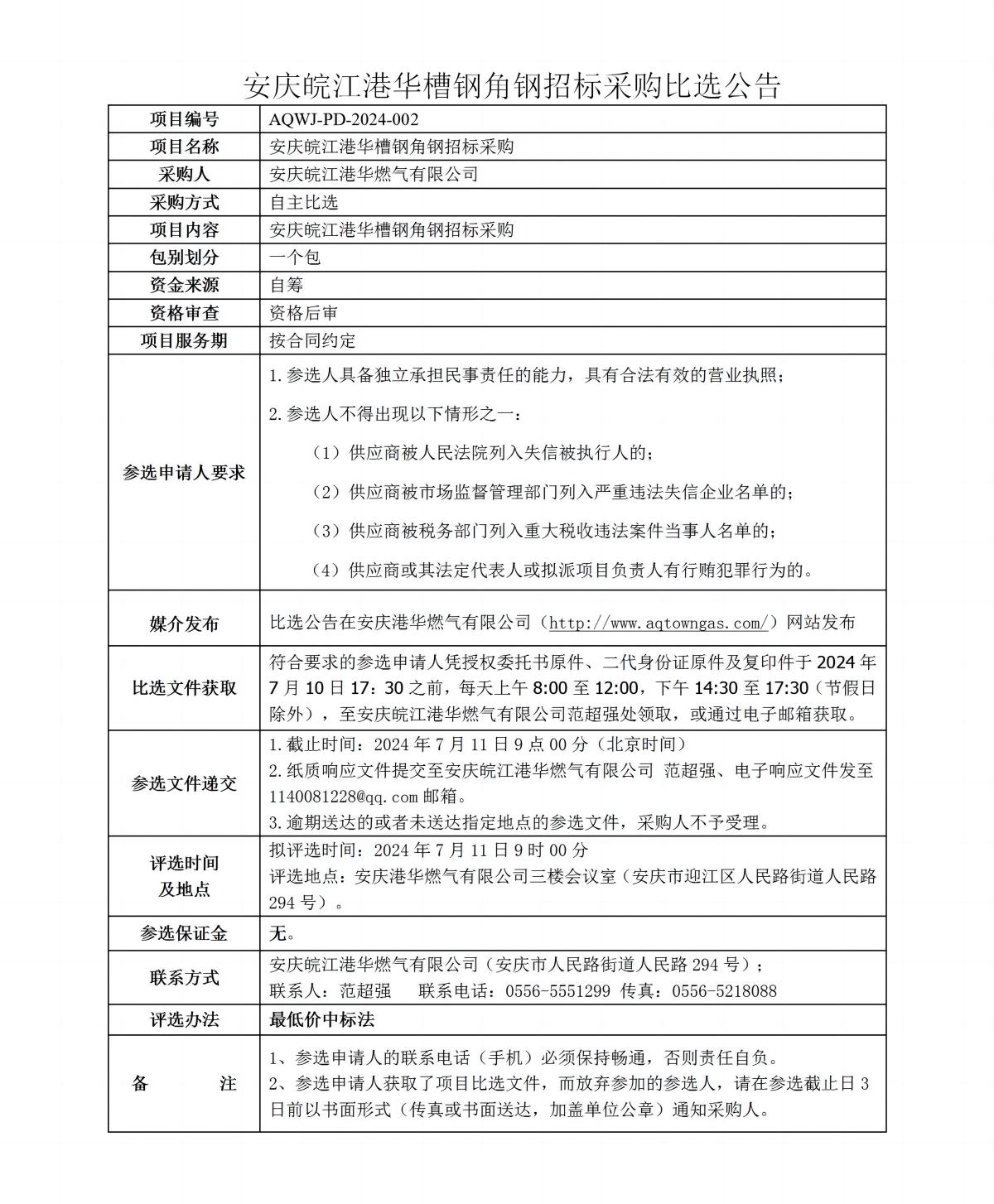 安慶皖江港華槽鋼角鋼招標(biāo)采購比選公告