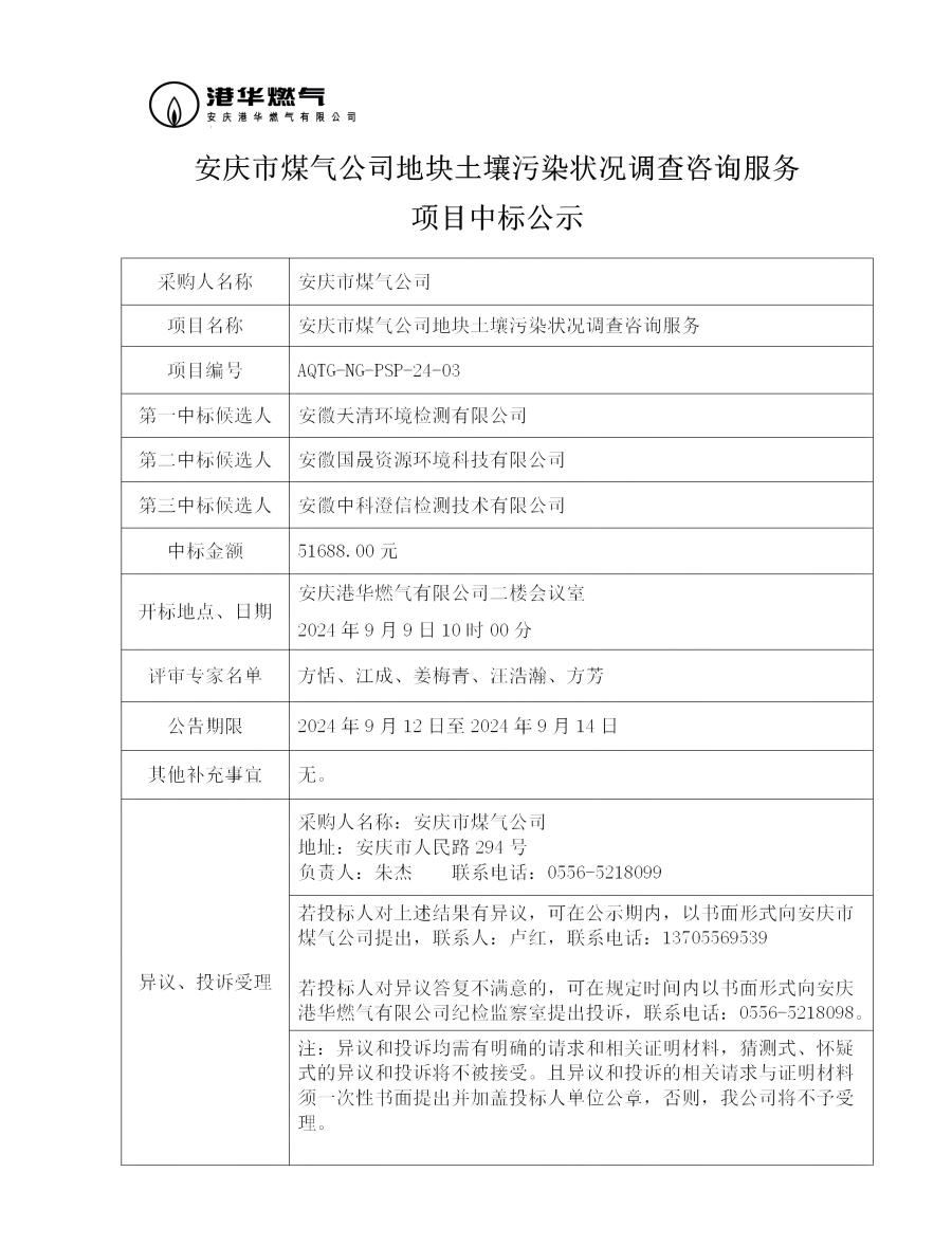 安慶市煤氣公司地塊土壤污染狀況調(diào)查咨詢服務(wù)項目中標公示
