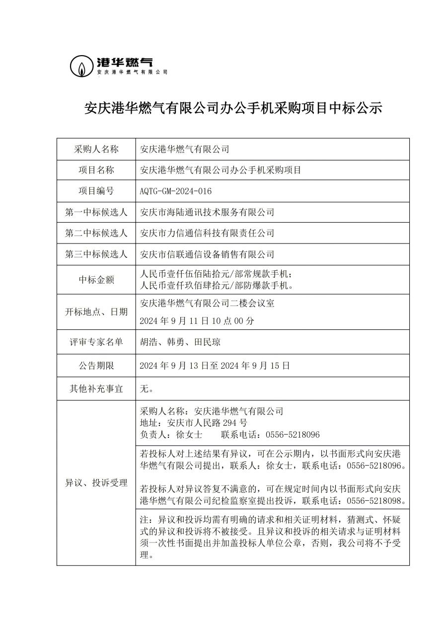 安慶港華燃?xì)庥邢薰巨k公手機(jī)采購項目中標(biāo)公示