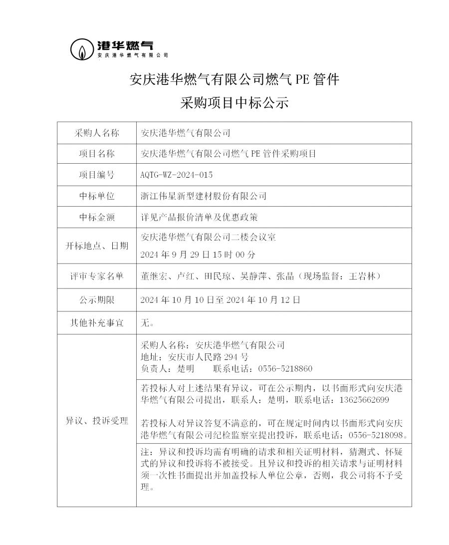 安慶港華燃?xì)庥邢薰救細(xì)釶E管件采購項目中標(biāo)公示
