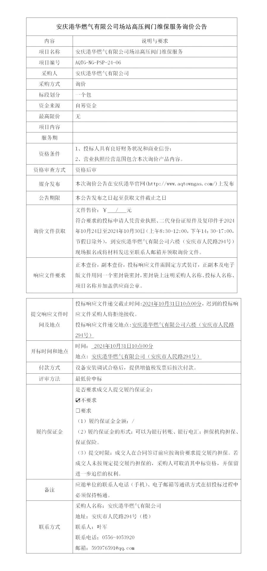 安慶港華燃?xì)庥邢薰緢?chǎng)站高壓閥門維保服務(wù)詢價(jià)公告