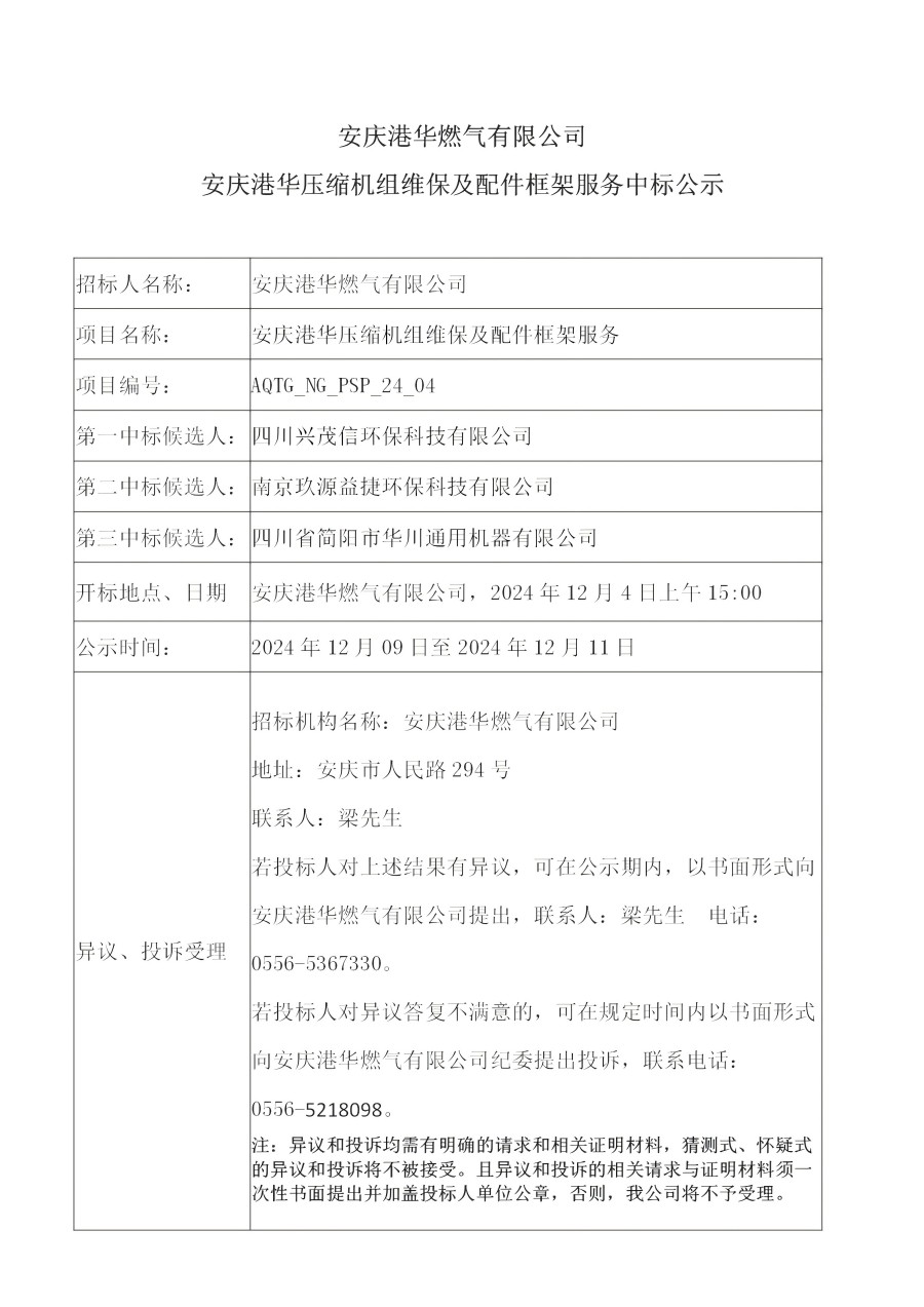 安慶港華燃?xì)庥邢薰景矐c港華壓縮機組維保及配件框架服務(wù)中標(biāo)公示