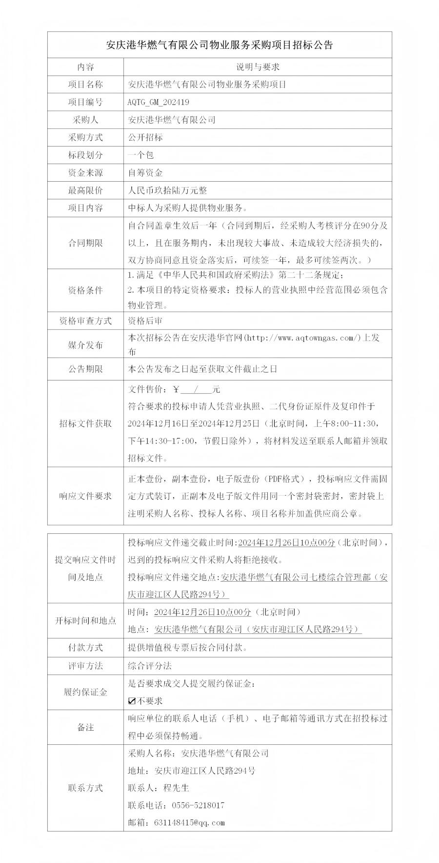 安慶港華燃?xì)庥邢薰疚飿I(yè)服務(wù)采購(gòu)項(xiàng)目招標(biāo)公告