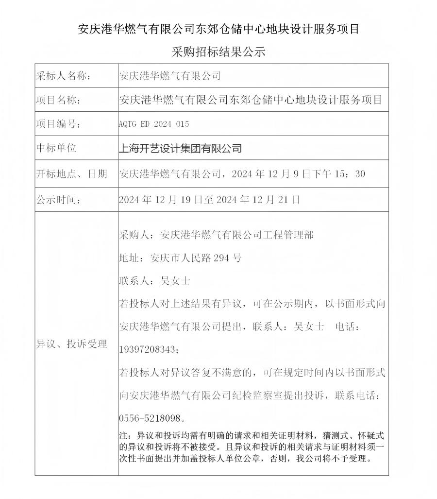安慶港華燃?xì)庥邢薰緰|郊倉(cāng)儲(chǔ)中心地塊設(shè)計(jì)服務(wù)項(xiàng)目采購(gòu)招標(biāo)結(jié)果公示