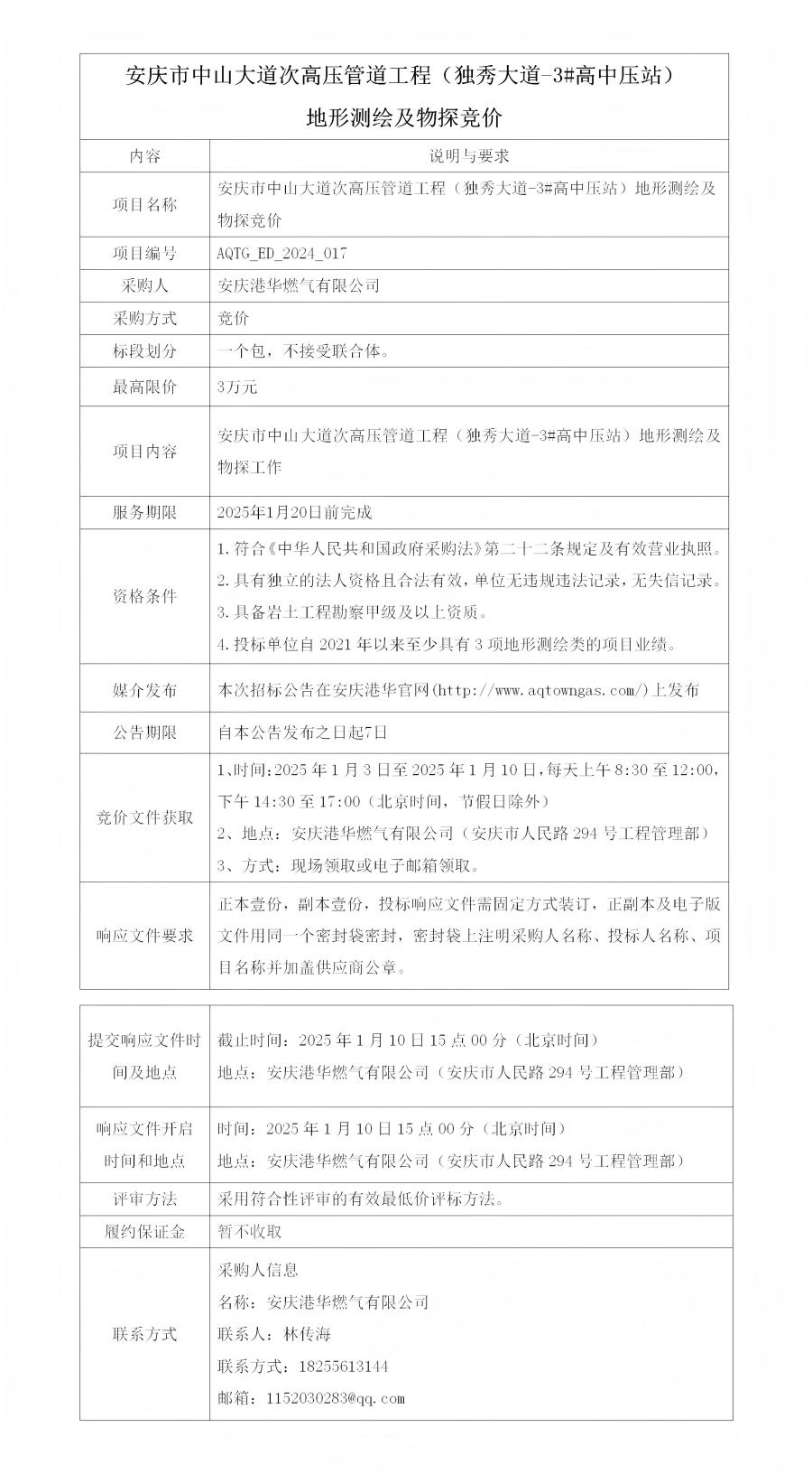 安慶市中山大道次高壓管道工程(獨秀大道-3#高中壓站)地形測繪及物探競價