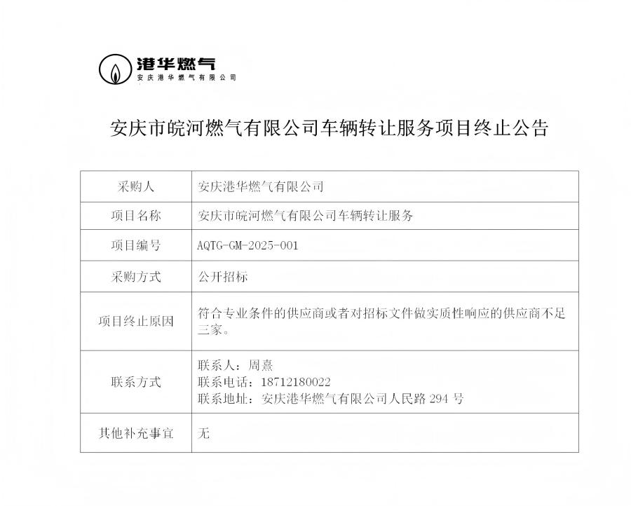 安慶市皖河燃氣有限公司車輛轉(zhuǎn)讓服務(wù)項目終止公告