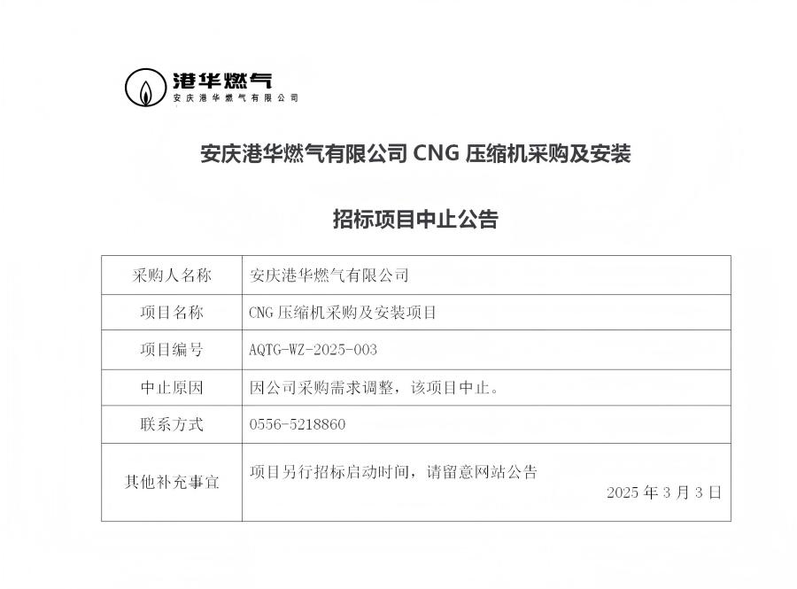 安慶港華燃?xì)庥邢薰綜NG壓縮機(jī)采購及安裝招標(biāo)項(xiàng)目中止公告