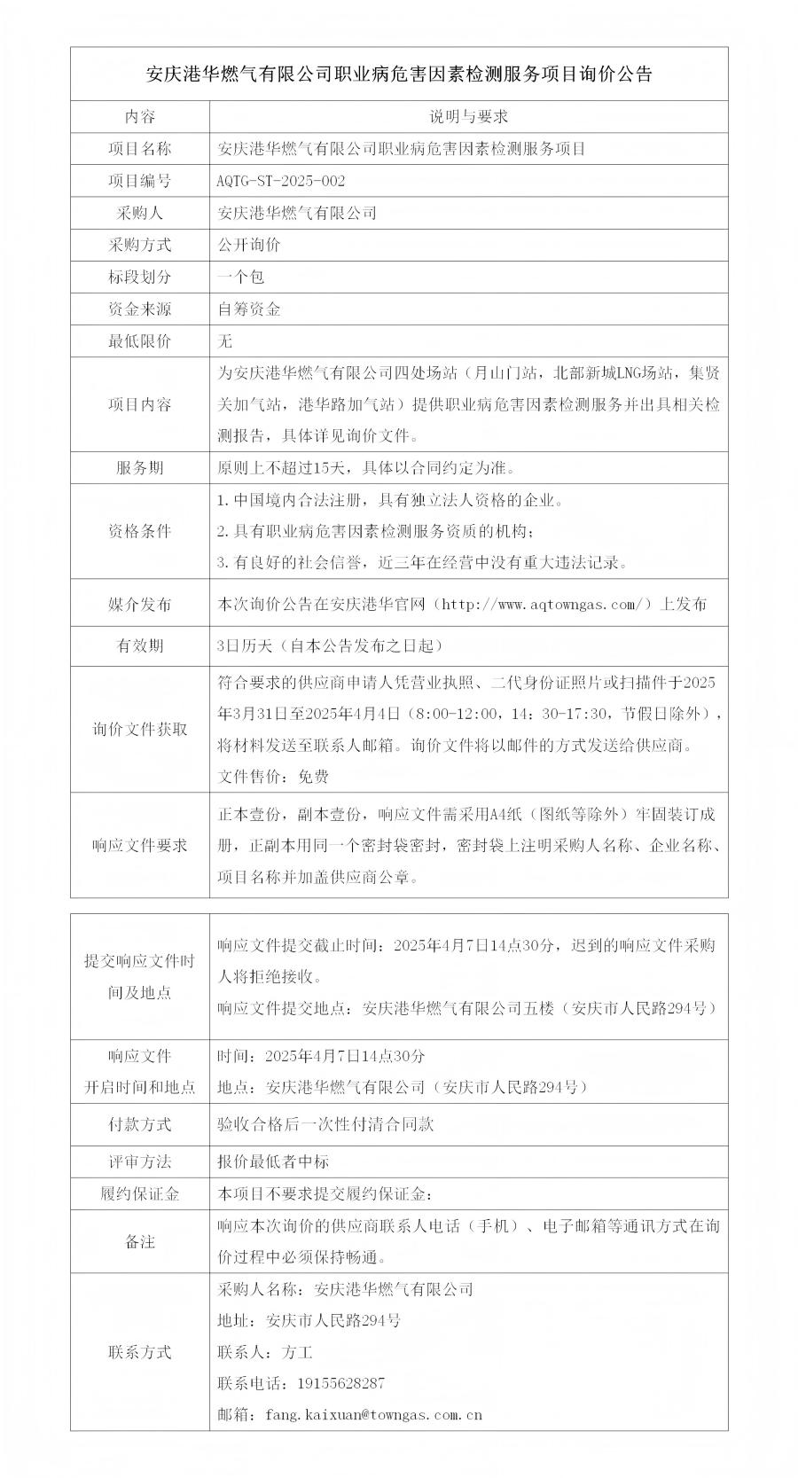 安慶港華燃氣有限公司職業(yè)病危害因素檢測服務項目詢價公告