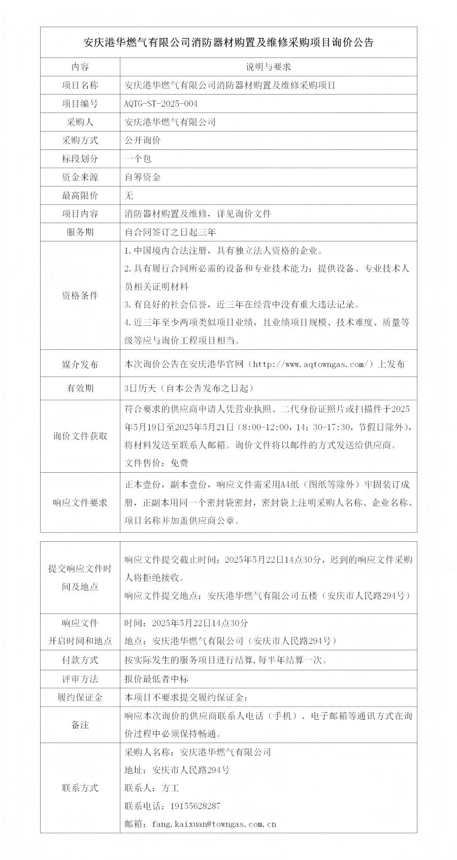 安慶港華燃?xì)庥邢薰鞠榔鞑馁徶眉熬S修采購項(xiàng)目詢價(jià)公告