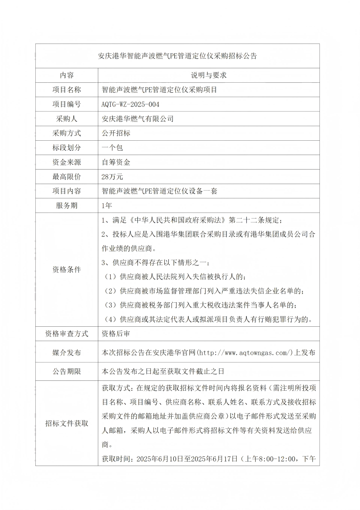 安慶港華智能聲波燃?xì)釶E管道定位儀采購(gòu)招標(biāo)公告