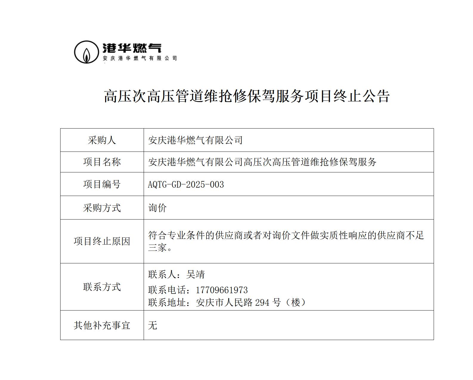 高壓次高壓管道維搶修保駕服務(wù)項目終止公告