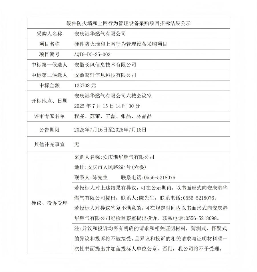 硬件防火墻和上網(wǎng)行為管理設備采購項目招標結果公示