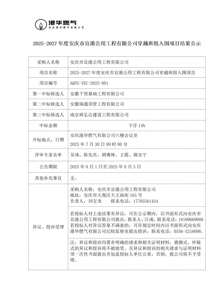 2025-2027年度安慶市宜港公用工程有限公司穿越班組入圍項目結果公示
