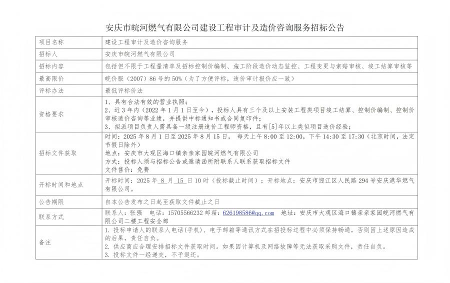 安慶市皖河燃氣有限公司建設(shè)工程審計及造價咨詢服務(wù)招標公告