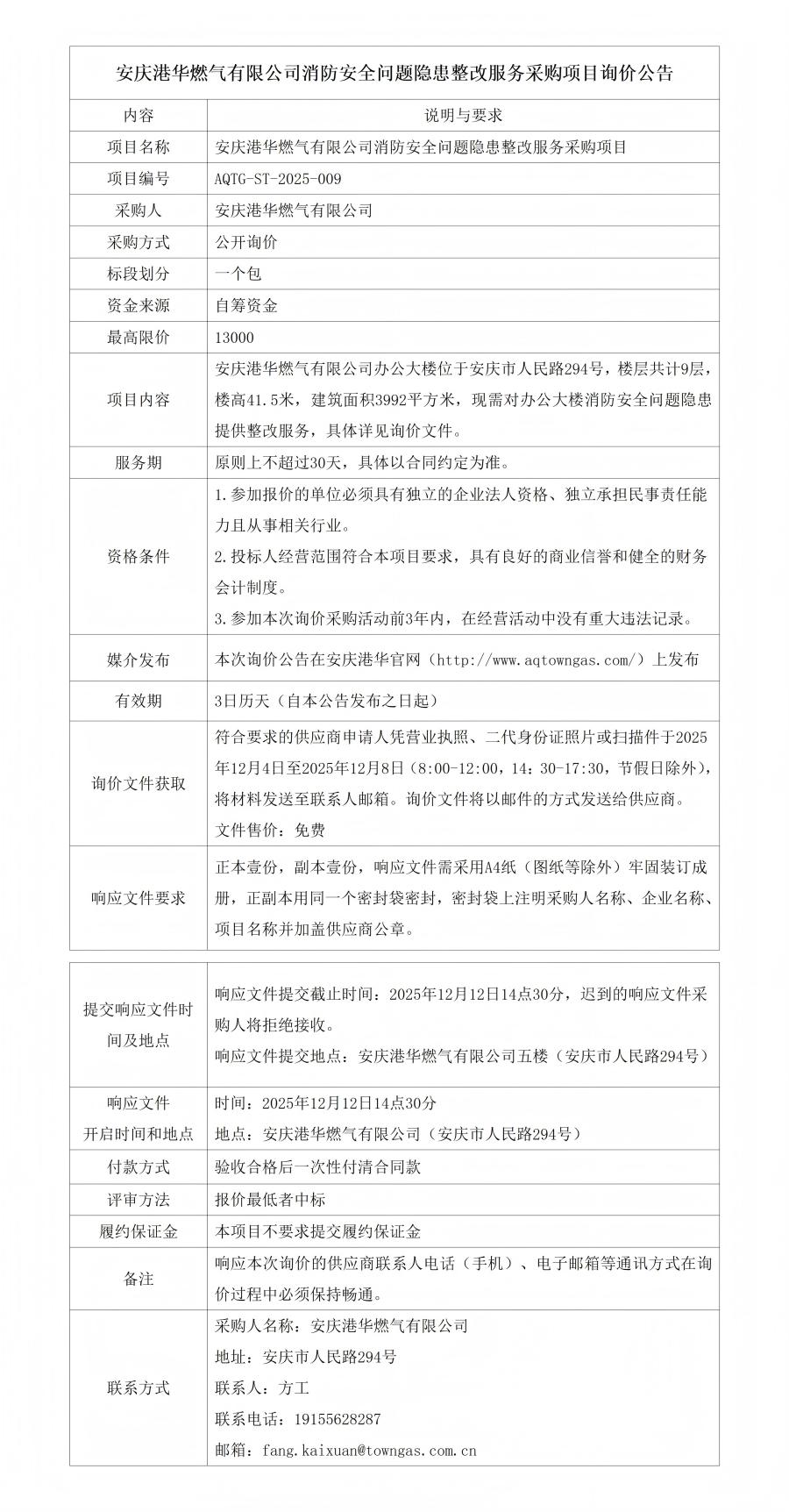 安慶港華燃?xì)庥邢薰鞠腊踩珕栴}隱患整改服務(wù)采購項(xiàng)目詢價(jià)公告
