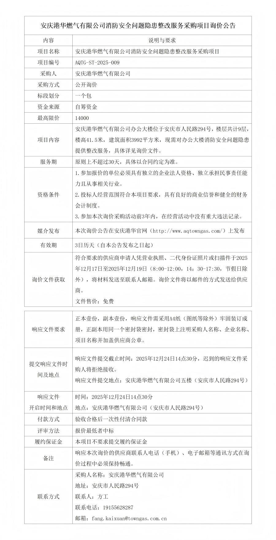 安慶港華燃?xì)庥邢薰鞠腊踩珕?wèn)題隱患整改服務(wù)采購(gòu)項(xiàng)目詢價(jià)公告