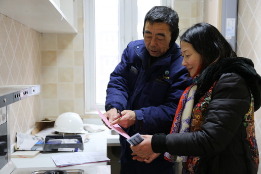 圖為客服維修人員冒著大雪為客戶提供維修服務(wù),并指導(dǎo)客戶安全用氣。
